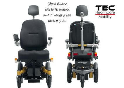 In situations that make using a standard-sized wheelchair difficult or perhaps even impossible (when encountering narrow lifts, door openings or pads), the SANGO slimline offers the solution. Although there are several wheelchairs on the market that can cope with such problems, battery capacity is often the compromise that users will be asked to make. But not where the SANGO slimline is concerned, as it is fitted with 60 Ah batteries.